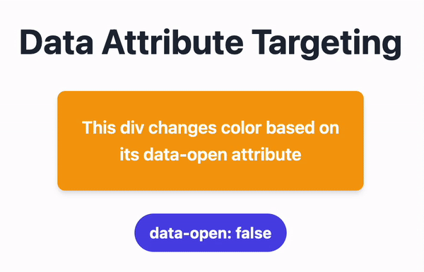 This technique allows for reactive styling without custom CSS or JavaScript, making it ideal for interactive components or state-based styling. The div’s background color will change to teal when data-open is “true” and to amber when it’s “false”.